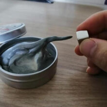 Cela n'a pas l'air joli du tout lorsque vous l'ouvrez pour la première fois. Rien de tel que les photos. Mais travaillez un peu dans vos mains et le matériau magnétique semble se mélanger avec le mastic et cela ressemble beaucoup plus aux photos. Donc, ce mastic est magnétique et vous trouverez un petit aimant carré à l'intérieur de l'étain avec le mastic. C'est la partie la plus amusante. Travaillez un peu le mastic puis posez-le sur une surface. Placez l'aimant à proximité mais sans le toucher, puis regardez le mastic «manger et avaler» l'aimant. C'est étrangement fascinant. J'ai acheté 3 boîtes et les ai sur la table basse. TOUT LE MONDE joue avec eux. Il y a juste quelque chose à ce sujet.