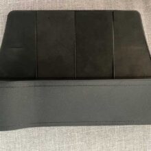This product is made of hard materials, making it easy to clean. Fits nicely between driver's seat and console in my car. Exactly what we were in the market for.